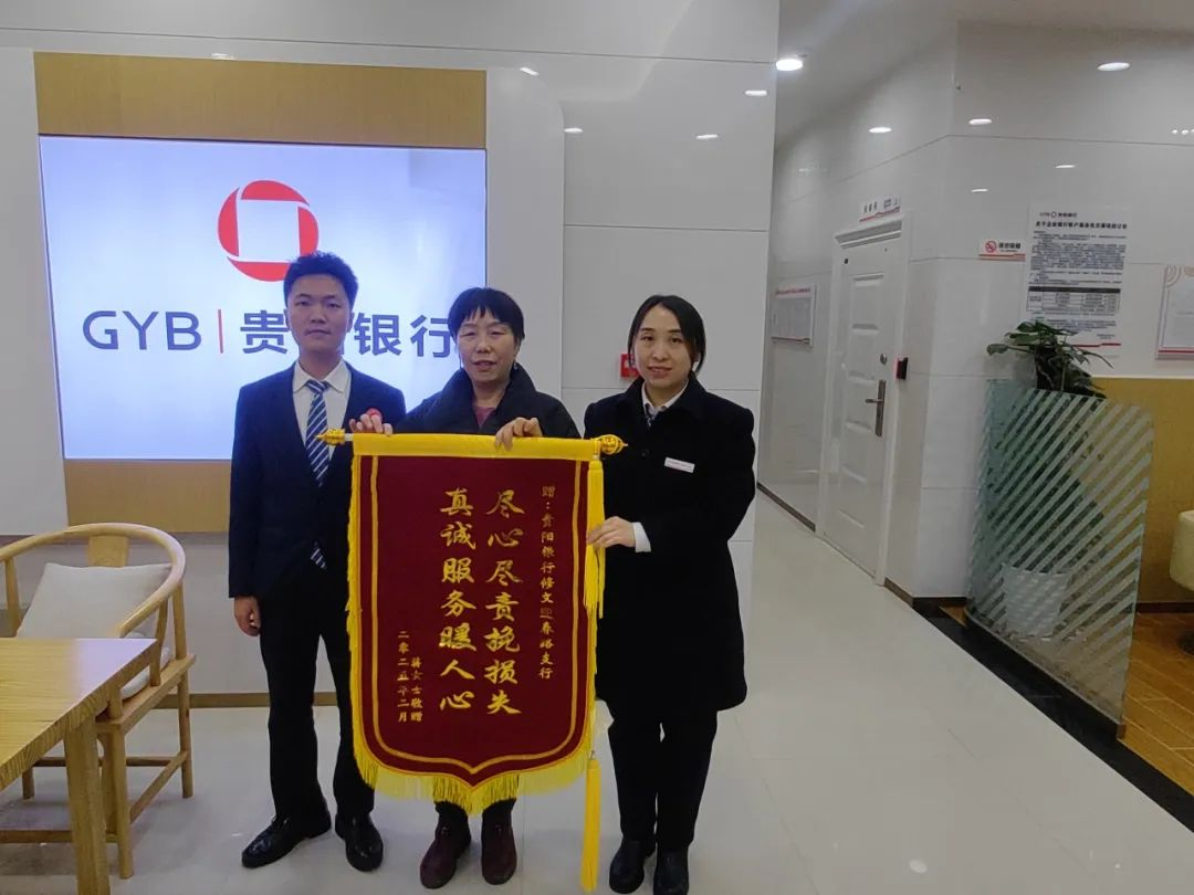 次日,退款顺利到账。贵阳银行工作人员第一时间电话告知了蒋阿姨这一好消息,并由专属客户经理对她进行了移动支付安全教育,帮助她提高金融安全意识。蒋阿姨对此感激不尽,特意制作了一面写有“尽心尽责挽损失,真诚服务暖人心”的锦旗送到支行,连声道谢:“虽然钱不多,但必须给你们贵阳银行点个大大的赞!”