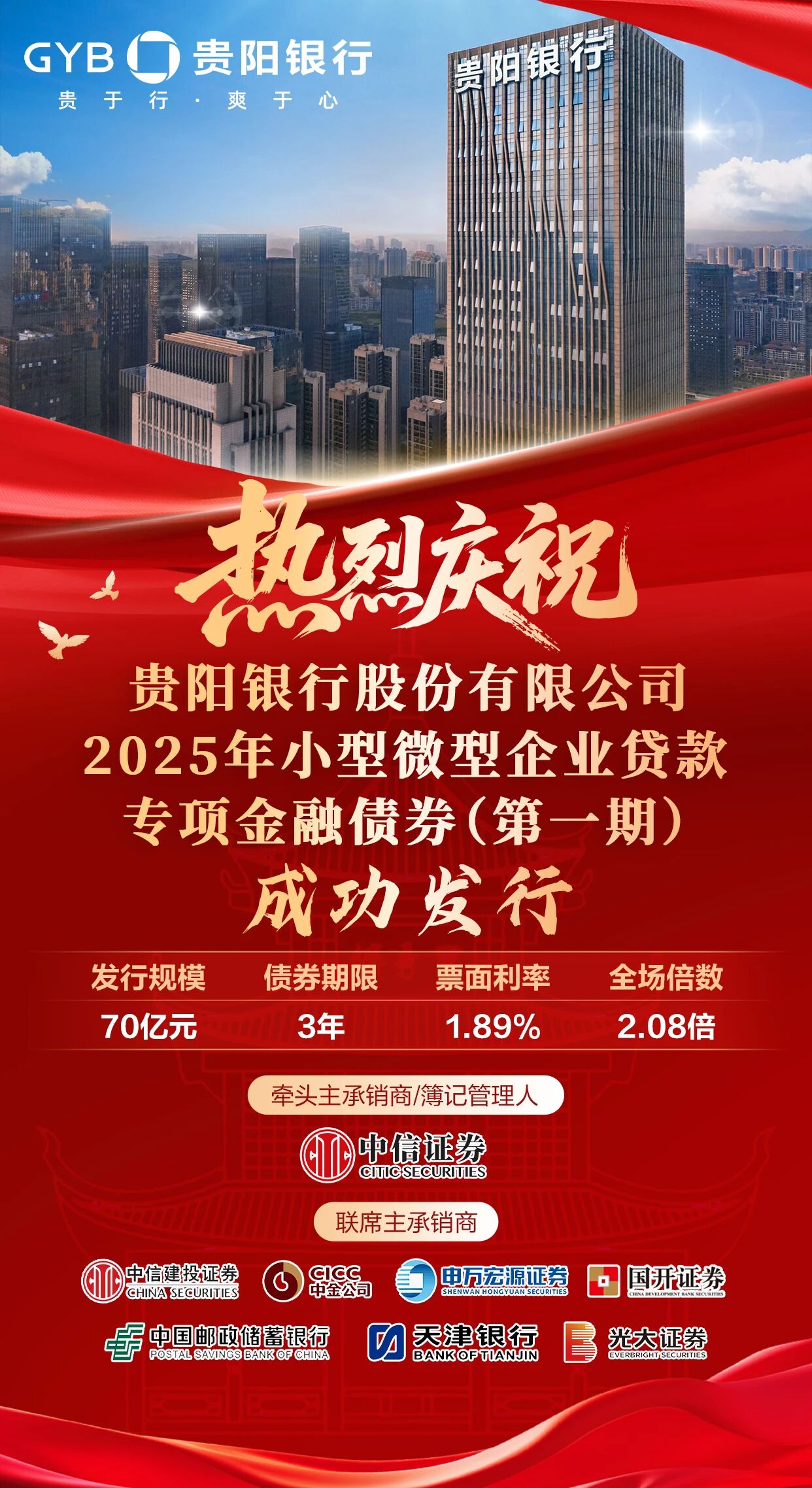 贵阳银行于9月9日成功发行“2025年小型微型企业贷款专项金融债券(第一期)”。本期债券规模70亿元,期限3年,票面利率1.89%,其中1亿元通过商业银行柜台市场面向机构投资者分销,该笔业务为贵州省首单通过柜台渠道发行的专项金融债券。