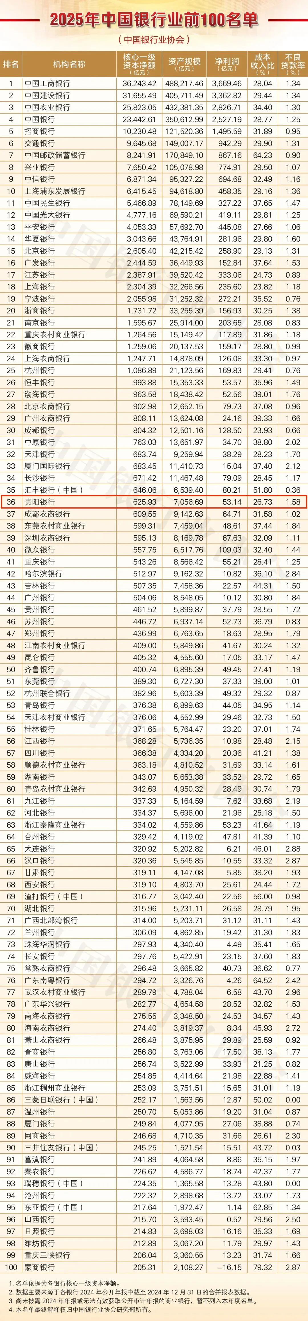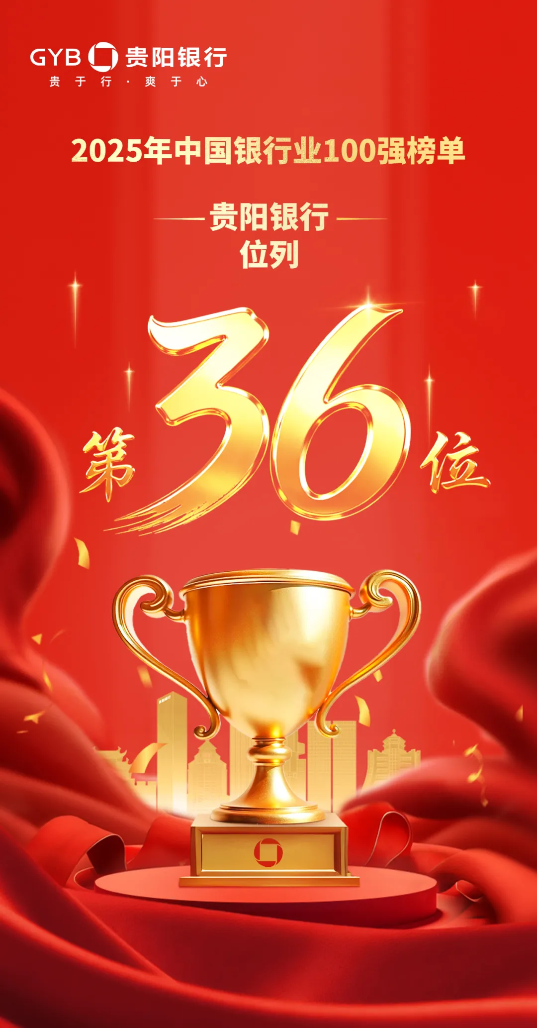 在此次“中国银行业前100名单”中,贵阳银行榜上有名,位列第36位,较2024年排位上升1位。