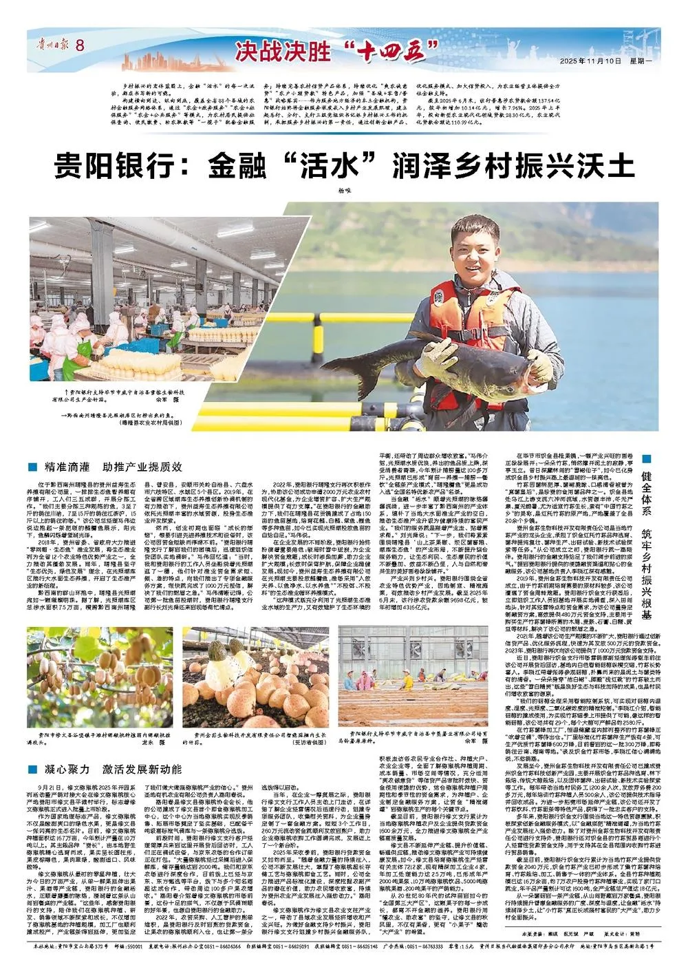 构建横向到边、纵向到底,覆盖全省88个县域的农村金融服务网络体系,通过“农金+政务服务”“农金+社保服务”“农金+公共服务”等模式,为农村居民提供社保查询、便民缴费、助农取款等“一揽子”配套金融服务;持续完善农村信贷产品体系,持续优化“爽农诚意贷”“农户小额贷款”特色产品,加强“县域+零售/普惠”战略落实……作为服务地方经济的本土金融机构,贵阳银行始终将金融服务深度嵌入乡村产业发展肌理,建立起总行、分行、支行三级党组织书记抓乡村振兴工作的机制,承担服务乡村振兴的第一责任,通过创新金融产品、优化服务模式、加大信贷投入,为农业经营主体提供全方位金融支持。