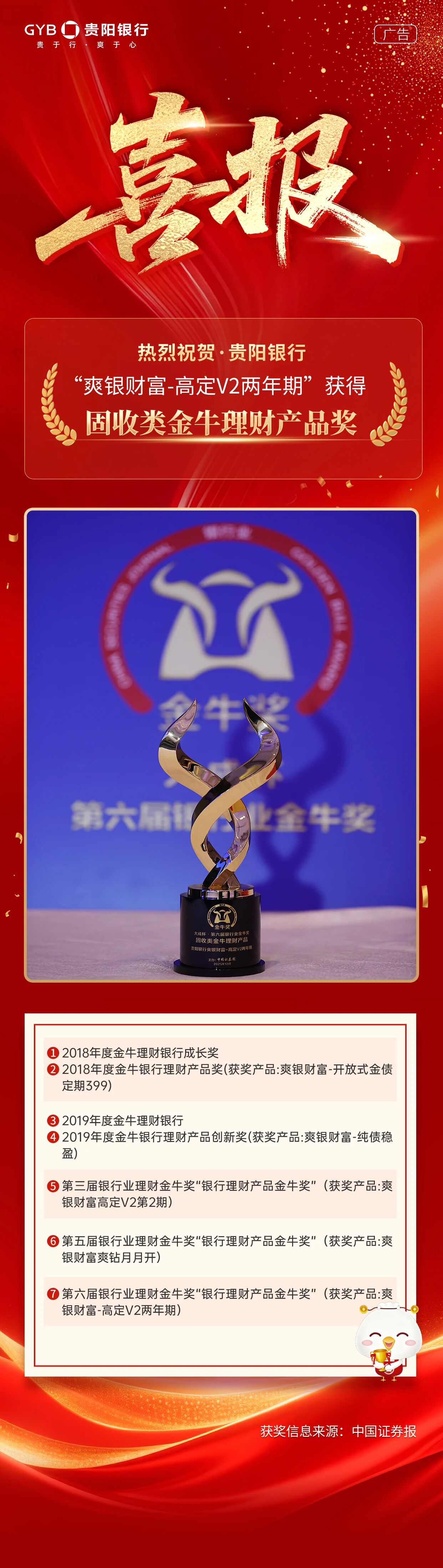 贵阳银行旗下理财产品“爽银财富-高定V2两年期”在中国证券报举办的“第六届银行业理财金牛奖”评选中脱颖而出,荣获“固收类金牛理财产品奖”!